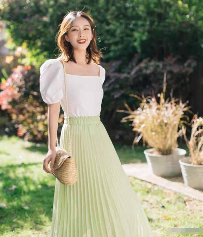 ③泡泡袖T恤+百褶裙+西装外套,Monday少女的元素都出现在这件上衣,一字领的设计大方露出锁骨位置,有着源源不断的青春感。我搭配了一条牛油果色的百褶裙,白色的凉鞋非常百搭,猫跟的穿着感非常舒适,背上一只草编包更加少女了。