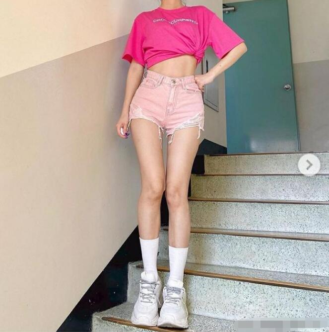 我们日常中喜欢这套的也是可以照着穿的,如果是臀胯比较粗大的,那就可以选择宽松点的短裤,一样有好看的效果。如果没有露脐衫的,可以选择T恤像博主这样的打结法,一样可以做露脐装。