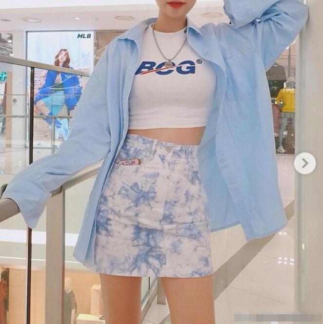 今年最流行的扎染就很适合用来搭配露脐装,搭配上同色简约字母的露脐装,实在是很韩妹ins风。外披一件蓝色衬衫,就能够遮住两侧有小赘肉的妹子啦。整体都是以蓝白为主,蓝白色的搭配更加的清爽夏日。