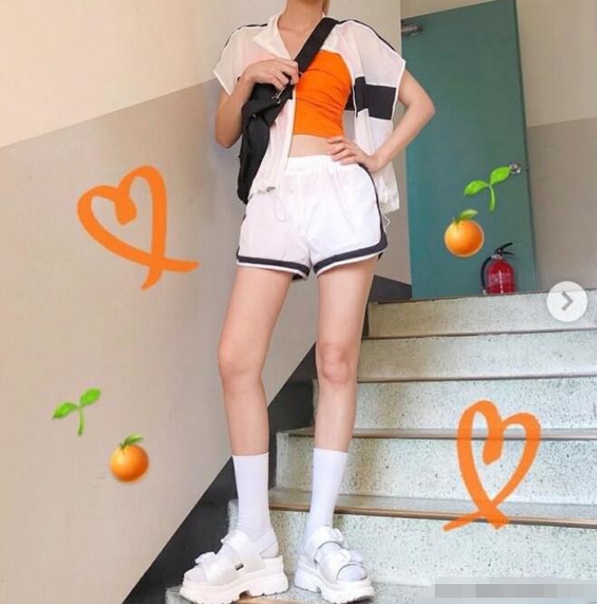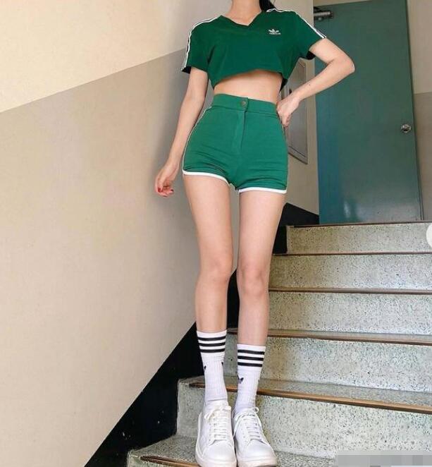 这时候我们日常look想走运动风的就可以像她一样选择比较运动风的短上衣搭配同色系的短裤,再加上运动的中筒袜,一样可以像博主一样的亮眼。(不一定要买阿迪的,只要是偏运动格即可)