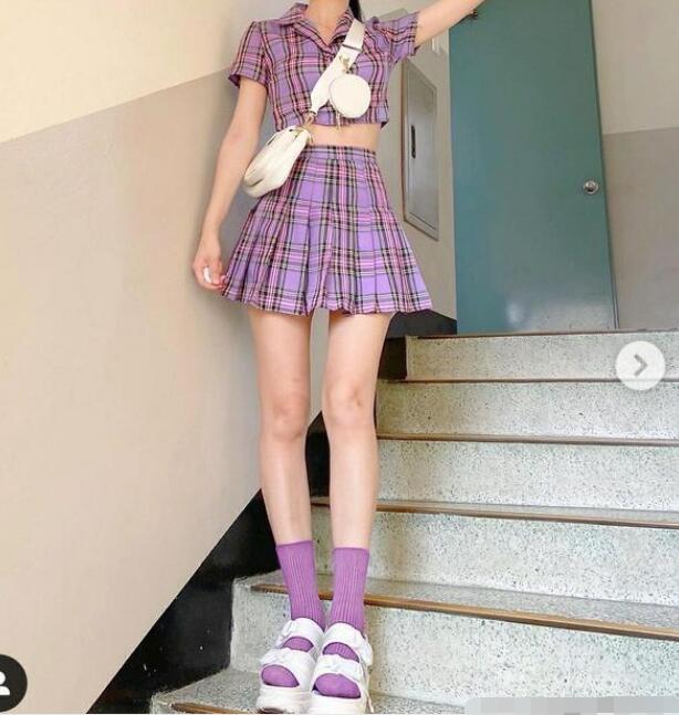 紫色真真真的是今年大热的一款颜色,这种偏温柔的紫色会给人一种淑女气质范。再加上格子 元素的百褶裙就更加减龄可爱了,这种紫色完全不会让人显黑。