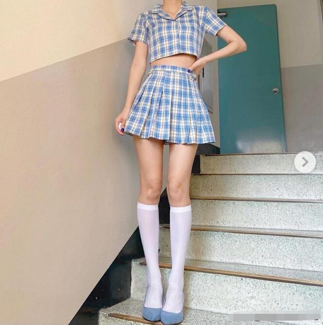 上面的那套就是温柔风的粉紫色格纹,这套的是比较俏皮水灵灵的蓝白格纹。如果不喜欢紫色的妹子可以尝试一下夏日baby蓝色,搭配上白色的小腿袜看起来更加日系少女呢!