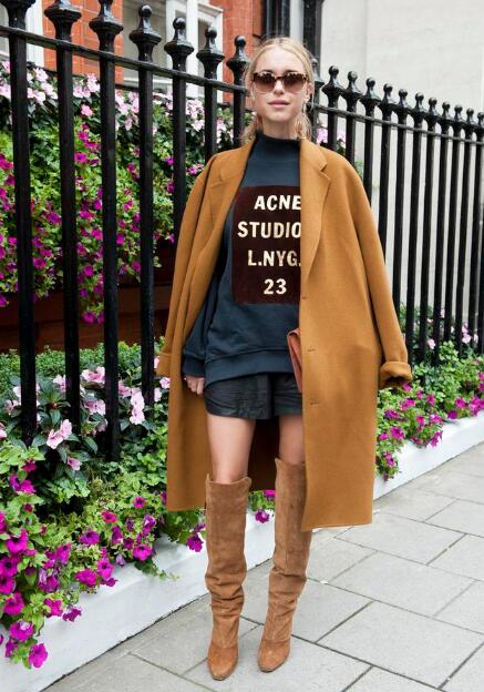 这里主要是因为个人的喜欢,还是建议大家穿那种不是特别长的大衣,然后再穿短裤,配上高筒靴,能把靴子的特点露出来,这样就很好看。
