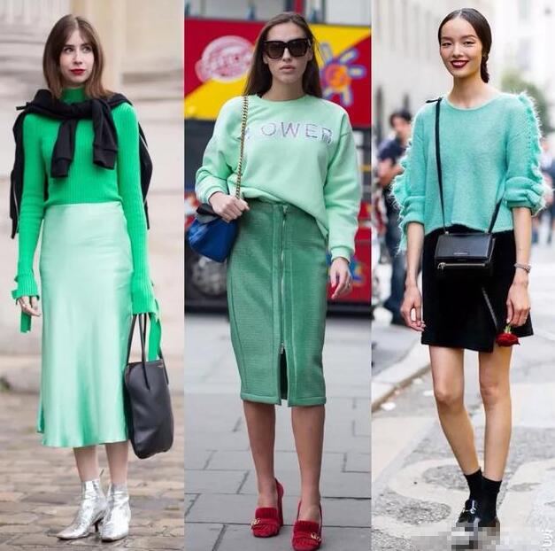 薄荷色可以和邻近色搭配,更显高级感,比如青绿色、墨绿色、天蓝色。绿色针织毛衣搭配薄荷色丝质半身裙,温柔与性感的碰撞,鞋子选择银色高跟短靴,中和全身的清凉感,再披一条黑色针织衫、拎着一款黑色包包,颜色不会杂乱,多了沉稳的味道。而薄荷色的卫衣与墨绿色皮质短裙搭配,再搭配一双红色单鞋,红+绿的撞色CP超级抢眼,时尚度直线飙升。