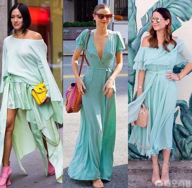 在夏季,穿一条薄荷色的裙子,有一种时时刻刻泡在水里的清凉感。米兰达可儿(中)穿一条薄荷色裹身裙,只用一款红色墨镜做搭配,女神范十足。在凉鞋颜色的选择上,裸色等接近肤色的颜色,会让你显得更高,色彩搭配也不会混杂。