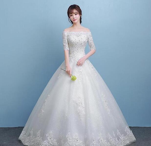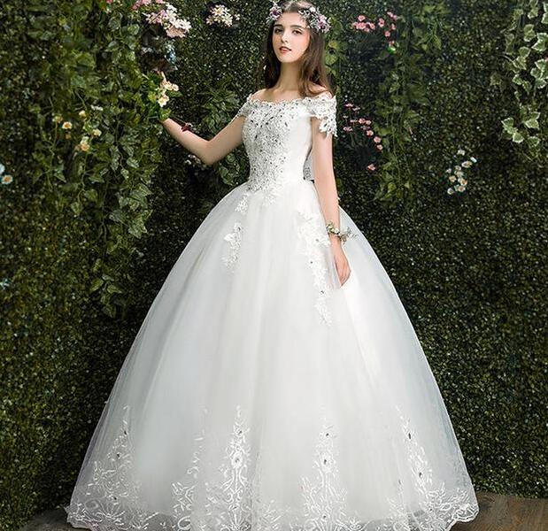 一款充满魅力的婚纱,它以一字肩将众人的视线吸引住,来感受这款婚纱的魅力,一字肩领将纤细的锁骨,优雅的颈部和精致的双肩展现,没有太多的俗媚感,更多的是惊艳美,这种美让人久久不能回神,彻底的迷失,精美的蕾丝贴花将其点缀,配合着收腰,展现出丰满的上围,纤细的腰肢,让你的好身姿展现而出,修长的曳地裙摆,伴随你莲步的轻移,不觉间竟有种梦幻般的感觉哦!