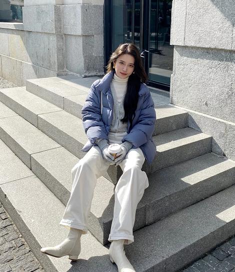 这个时候蓝色的羽绒服就是个比较不错的选择,蓝色不挑人,不挑肤色,下身搭配一条白色宽松版型的裤子更是显得人比较洋气,而且精致的女孩子通常都是比较偏爱浅色系的,这样才能显得肤色更亮,气质更加脱俗,搭配一双白色的时装鞋更是显得清新脱俗,干净利落。