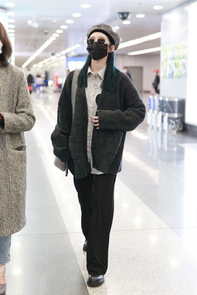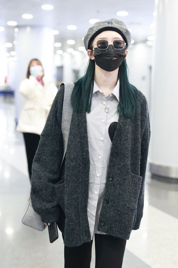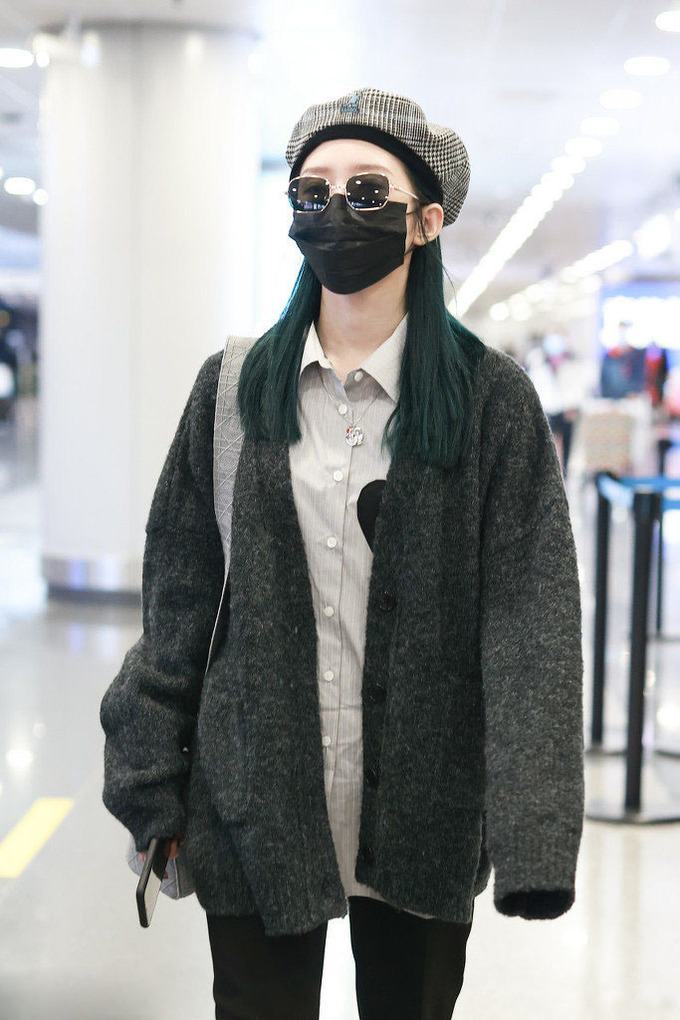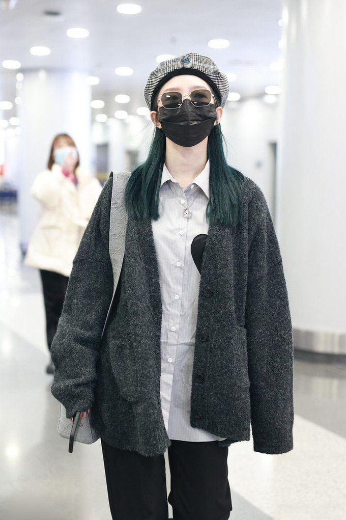 衬衫长度和开衫差不多,这种内搭不塞裤腰的穿法,和外套形成了巧妙的叠加,最适合个子高挑纤细的女生穿。孟美岐还在脖子上配了一款可爱的透明项链,细节感十足,绿长直发太少见了。不愧是当红爱豆,能驾驭各种高级彩色系发型,配上黑白格纹贝雷帽,复古时髦感扑面而来,女装搭配,孟美岐走复古酷帅风每次都能让人眼前一亮。
