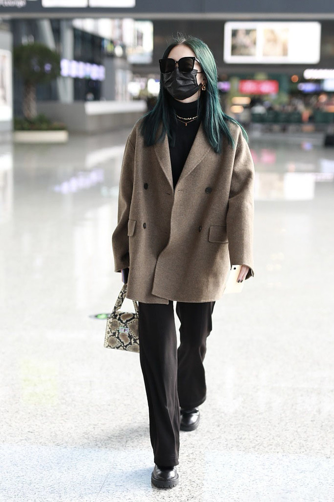 但机场中还是以酷帅干练居多,孟美岐还擅长用同样的单品搭配出不同的造型,前两天的机场,她穿得也是西裤和皮靴,下半身完全没变。上半身换了,变成了高领衫和西装,黑色高领衫修身显瘦,非常温暖,和项链搭配最时髦。西装是少见的燕麦色,这样的西装看起来就很独特高级,包包是蛇纹手提包,动物纹包包和干练霸气的造型最适合搭配在一起。