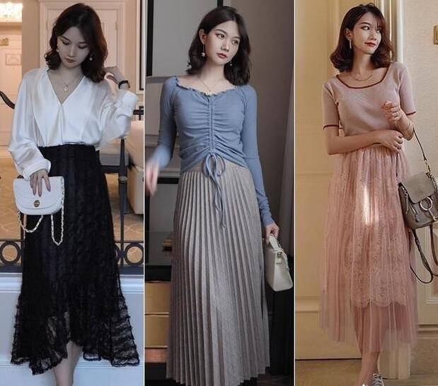 日常的穿搭多以通勤为主,温柔知性感更能体现个人魅力,不规则的黑色镂空半裙搭配真丝面料的衬衣,黑白组合,经典不过时,粉色的蕾丝纱裙搭配粉色大方领上衣,温柔又端庄。