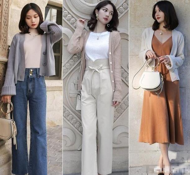 牛仔长裤搭配米色上衣,外搭短裤的针织小外套,个性又知性,很简单的穿搭,但很耐看,或者焦糖色的吊带连衣裙搭配米色的针织外套,尽显女性魅力。