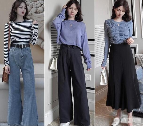 女生穿衣搭配讲究的是精致感,而长裤长裙更容易拥有这种感觉,微喇叭的牛仔长裤搭配条纹的上衣,高腰的设计拉长身材比例,更显高挑感,黑色的阔腿裤搭配紫色纱质上衣,卷月又温柔。