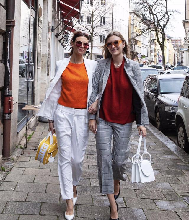 这是白色与橘色的撞色搭配,橘色的针织衫很是修饰,比较的甜心和温柔。外面搭配白色西装外套就会显得女人特别的有内涵,是一种独一无二与众不同的气质,既有气质又非常的知性柔美。