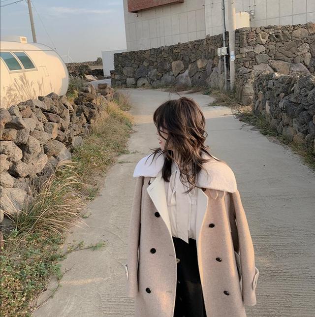 卡其色同样也是超显白的一款颜色,冬天不必总是穿得死气沉沉,那样只会让人觉得不够时尚,不如时常换一些浅色系的服饰,很容易呈现出温柔的风格。这款卡其色的大衣也不挑人,小翻领的设计能够让女性露出一部分内搭,所以最好选择高领毛衣,这样才不会让整个脖颈处呈现出大面积的留白,也不让寒风有灌入领口的机会。