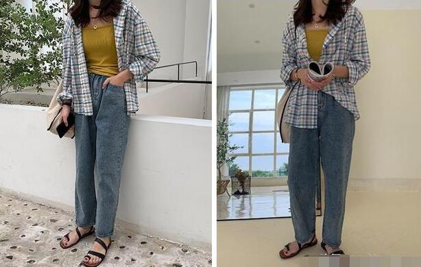 正值秋天,衬衫完完全全可以充当外套穿,小清新的格子元素,很减龄,与黄色的小吊带搭配,精致多了,修身的直筒裤与之搭配,总有意外好看的惊喜感,25岁这个重要的阶段,既不能穿得太成熟,也不能穿得太幼稚,而这样穿,刚刚好!