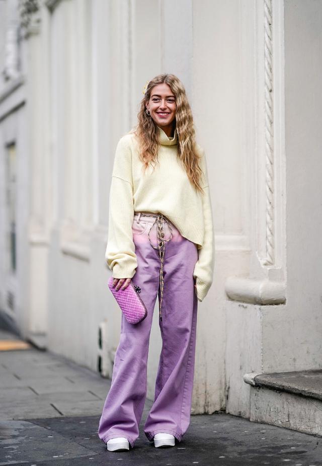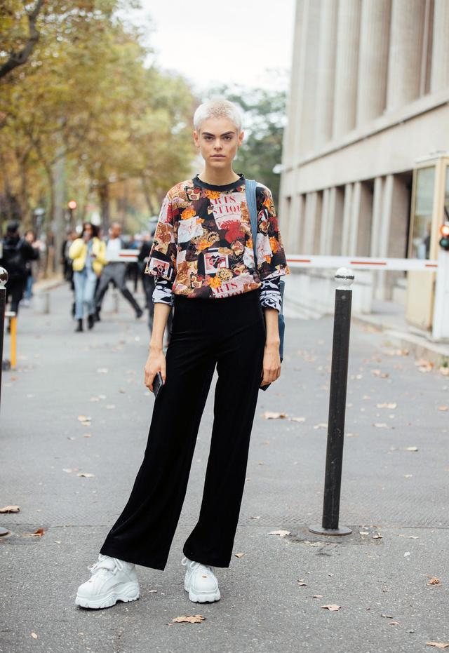 阔腿长裤可谓是今年的流行趋势了,拖地的慵懒风在视觉上营造出一种视觉上的空荡感,搭配一双平底帆布鞋显瘦又显高,上衣配一件高领毛衣,底部束到裤子里,打造高腰线,拉长腿部比例,时尚感满满!