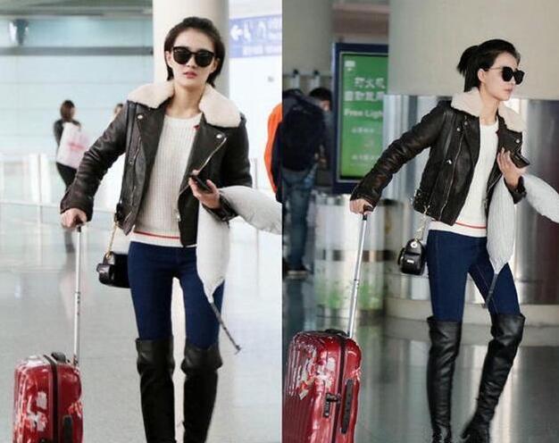 相对硬朗的轮廓,酷酷的线条,自带叛逆属性是机车皮衣的特点。男装搭配!帅气的机车服不再搭配百褶裙,而是与深蓝色紧身打底裤and过膝靴,组合成“娘man”风,徐璐这一套look真的是撩妹无数了!