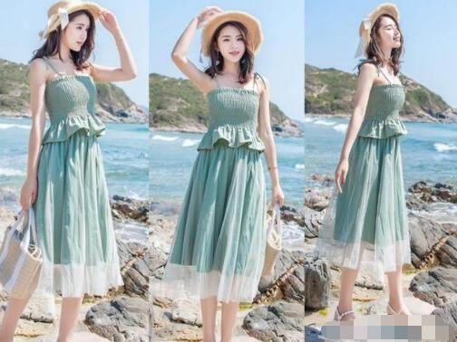 可爱的绿色连衣裙,很显气质,修饰腰身,很显瘦,吊带的设计,性感又凉爽,露出迷人的锁骨线条,收紧的腰间设计,凸显小蛮腰,过膝的长裙款式,很适合腿粗的女生穿,遮住腿型的粗线条,淡淡的浅绿色,很显气质,下摆的网纱的元素点缀连衣裙,很小清新,搭配一字带裸色高跟凉鞋,很显高哟。