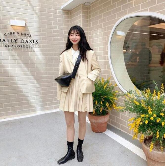这套穿搭很适合通勤装,春秋季节穿比较适合。米黄色的套装内搭白色衬衫搭底,颜色搭配看起来也是顺眼很多。选择棉麻料的米黄色套装百褶裙可以很减龄,如果喜欢走甜美风的女生可以尝试一下西装套装,可能有的女生会觉得太过于甜腻风,那么可以搭配一双黑色皮中筒靴,化身甜酷小姐姐。