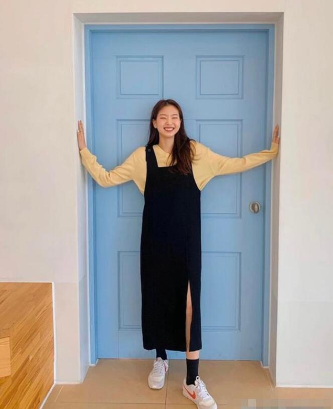 这套穿搭比较适合秋天得时候穿,里面得米黄色打底衫是比较暖和的薄款针织衫,很适合秋季穿不会太冷也不会太热。搭配上活泼俏皮的黑色背带裤,黄黑色的搭配看起来也是很舒服的,不会让人很难以接受。