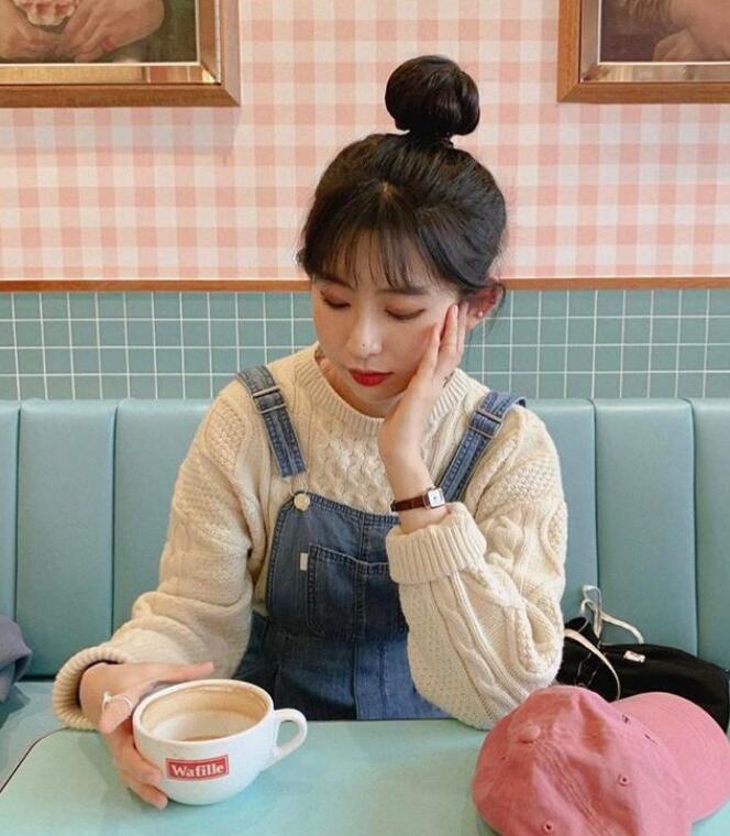 这套穿搭就适合冬天的时候穿,这件比较厚的毛衣很适合冬天,比较的厚实。外搭配一件牛仔连体裤,看起来十分的减龄,搭配上元气的丸子头,更显俏皮可爱。不仅冬天的时候可以这样穿,夏天的时候也是可以把毛衣换成米黄色短袖,也是依旧很可爱小清新。