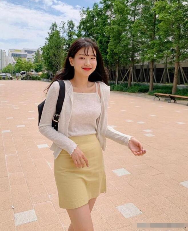 这套米黄色半身裙的搭配风格比较淑女,很适合喜欢穿米黄色淑女风的女生。吊带开衫对身材的要求有点高,但是穿上真的会超级显淑女范。若隐若现的锁骨,搭配性感小吊带,十分的有气质。这套穿搭比较适合春夏季穿,天气热得时候可以脱掉开衫。