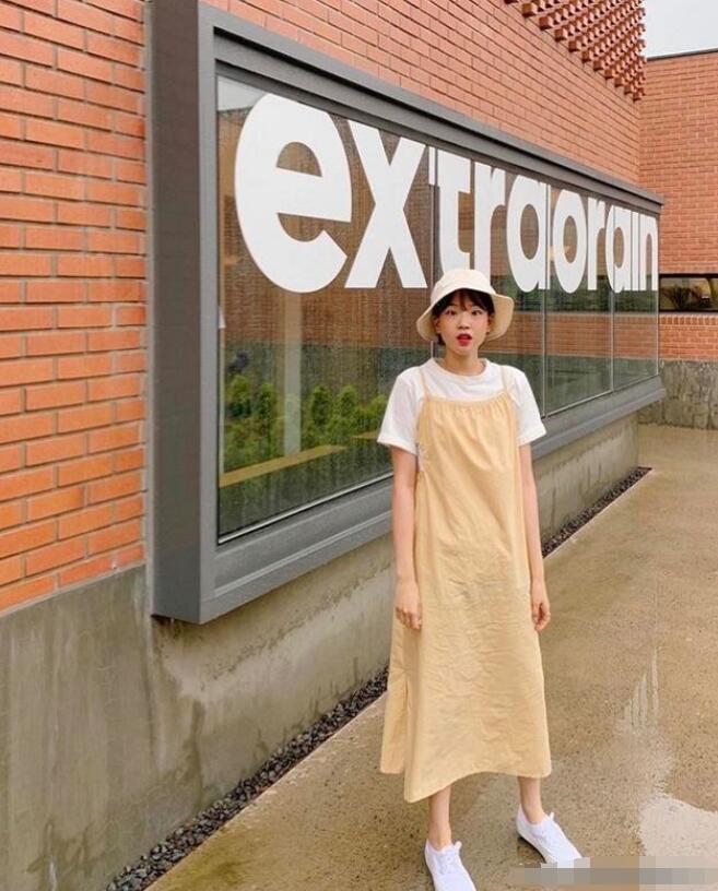 夏天热的时候也是可以单穿米黄色的吊带裙,看起来会更加的性感,但是会更加的挑身材。微胖的妹子就可以像图片的穿搭一样,内衬一件白色T恤,俏皮中带点小性感,会更加适合想要减龄的小女生。