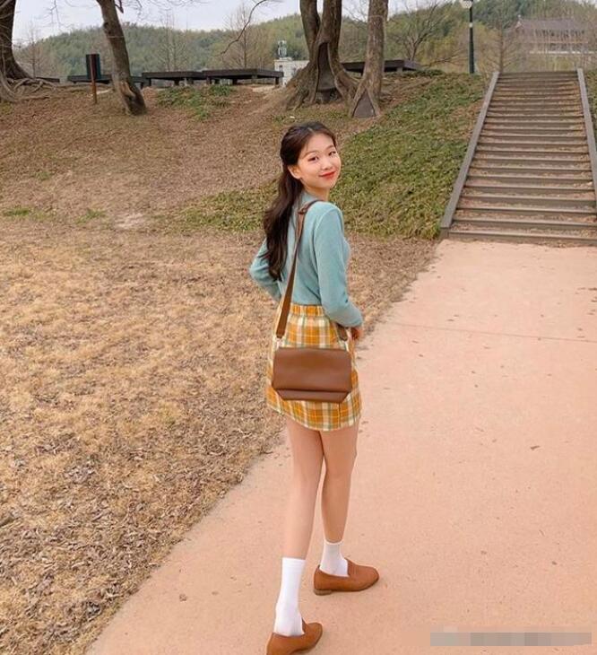 上身针织衫就很适合抵御秋天的微丝凉意,下身搭配一件毛呢的复古格纹半裙,男装搭配,扎上半扎马尾,满满的淑女大小姐气息。秋天的时候最适合的就是深卡其色,深卡其色的单鞋就很适合秋季,所以搭配上这套look,走起路都是自带摩伦味气息。
