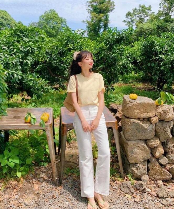 纯素色的米黄色T恤搭配白色的阔腿裤,很适合有肉感的妹子,不用怕显腿粗。为了能够显高点,可以把衣服塞进裤头里,可以视觉拉长腿部比例,看起来更显高挑。