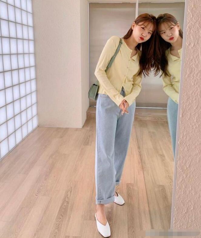 这套穿搭比较适合春夏季穿的。本身开衫搭配牛仔裤就是比较休闲的穿搭,但是搭配上方头平地鞋的话秒变气质淑女。如果是个子比较矮的女生的话,就比较适合选择拖地裤款的牛仔,更能显高,这种卷脚的裤子会没那么的显高,还会显矮。