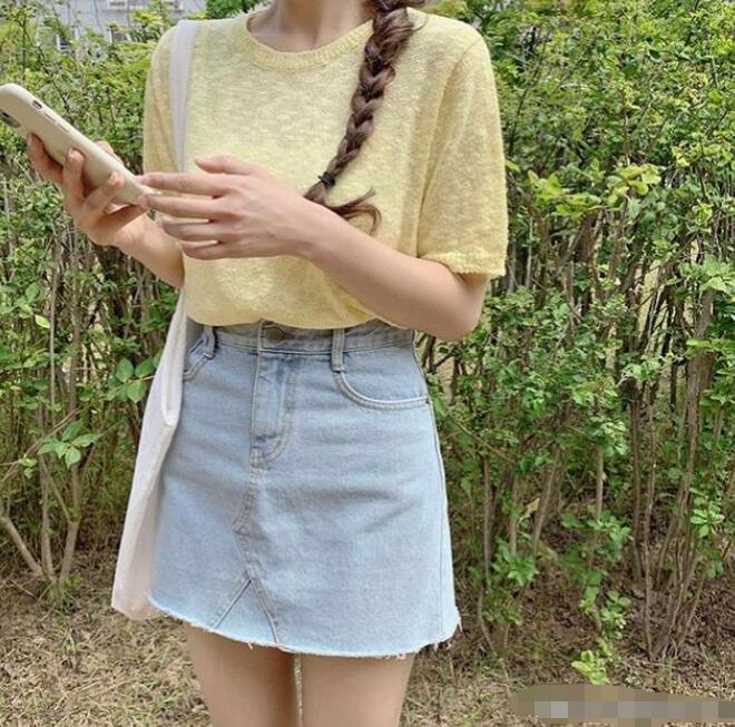 这套黄蓝色的搭配就超级适合夏天的时候穿了,不一定要米黄色,深一点的淡黄色也是很适合和牛仔裙搭配的,这种短袖针织衫可以选择比较薄的针织衫,夏天穿的时候就不会那么的热。黄色的T恤有些料子比较薄透的可以在里面内搭一件白色小背心,防曝光。