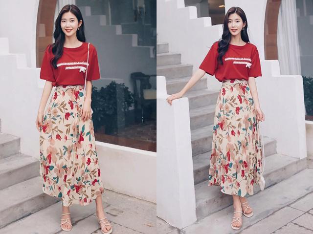 夏季是很流行穿短袖T恤的,非常的百搭又舒适感,穿上身超级清爽的,这样的单品可以搭配一条百褶长裙,可以凸显女性的优雅,这是今夏很时尚的穿搭,谁穿都很好看。
