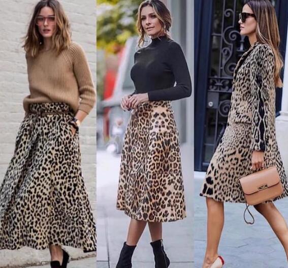 豹纹基本上所有的款式都适合,今年比较流行的是豹纹半裙,豹纹长裙不是很推荐,因为单穿的话比较难穿好看,反倒是容易像大妈。如下图。