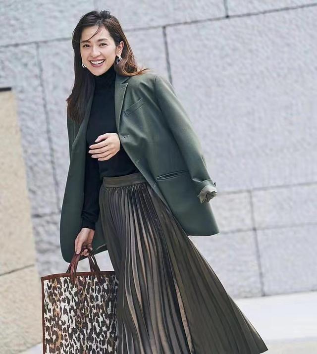 职场女性最喜欢的单品之一就是西装了,搭配西装的时候有些人喜欢宽松一些的风格,因为这种宽松的西装外套可以当披风来穿,而且搭配裙子也是非常好看的,搭配百褶裙面料有些小反光,更显得有时尚感,颜色色系十分相近的话,我们可以在配饰上面选择一些大胆创新的,比如拿一个豹纹的手提包也是非常独特的。