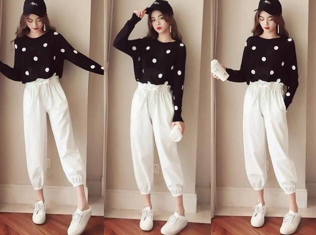 九分设计的裤子非常适合这个夏天穿着,也是今年流行的裤子款式之一,小露脚踝,性感又凉爽,花苞的腰身+宽松的裤身,随意穿起来都很好地修饰你的身材,整体感觉显瘦又显气质,干净的白色,棉质的布料,穿起来舒适又时髦,而裤脚的松紧设计,增加穿着的舒适度,还让你的腿型变得更美,搭配黑色波点T恤,这样穿时髦又显瘦,还很显腿长。