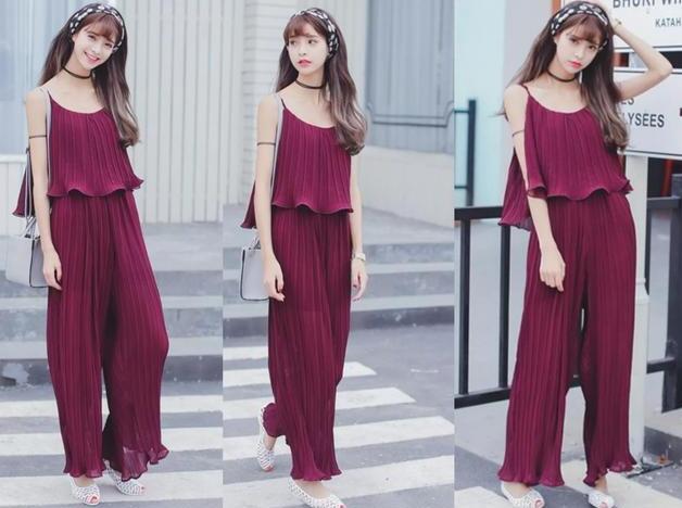 夏天很流行穿这种雪纺设计的单品,那么这款雪纺阔腿裤,想必也是大家都喜欢的一款,敲显瘦的款,夏天流行穿什么裤子?配什么上衣显白又显气质的酒红色,怎么穿都美的,裤子竖条纹压褶的设计,视觉上拉长腿部比例,看着就显腿长了,上衣配上一件同色系的吊带衫,更是避免了搭配的烦恼,而短款的版型,轻松穿出显瘦又显高的造型。
