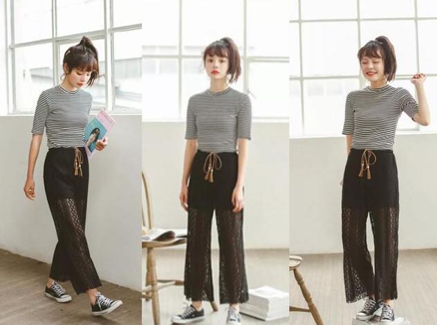 夏天穿什么衣服最合适呢,当然是那种清爽又舒适的衣服啦,这款直筒设计的裤子,是今年流行的裤子款式哦,上身修饰身腿型,穿出来的效果显瘦又美,太多女生都喜欢这款了,九分的裤长,又让你整体造型显高了不少,裤子上身是棉质的短裤,而下身又是镂空的设计,个性时髦又满满的造型感,上衣配上一件条纹T恤,夏天这样穿真心吸睛迷人