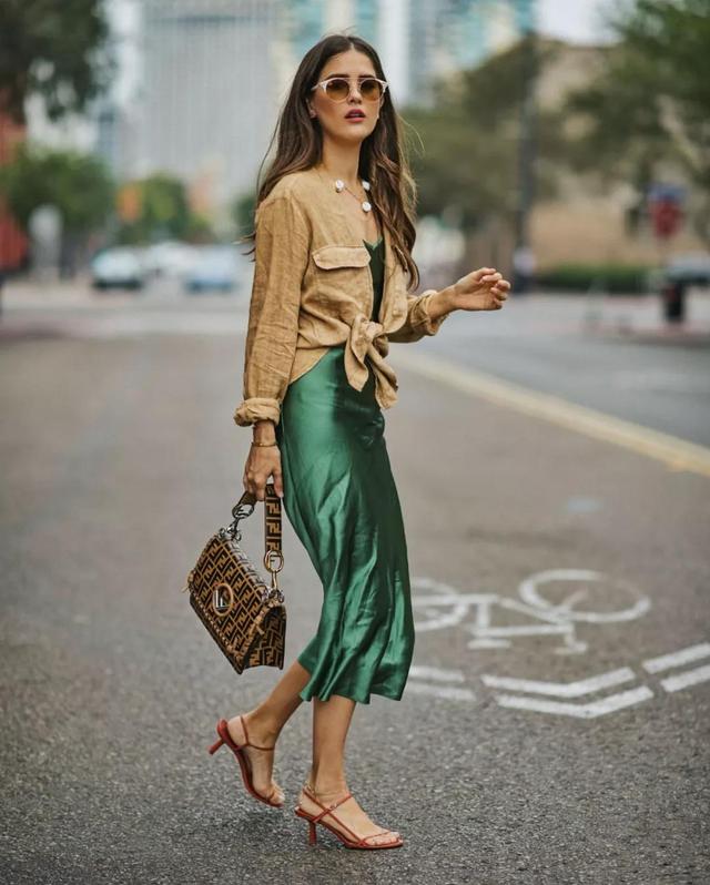 丝绸面料到底有多好,在古代可是王室贵族才能使用的。放到现代也是体现高级感的绝佳元素。这款墨绿色丝绸裙第一眼就很有古典美,低胸款营造出十足的性感,加上到小腿的长度慵懒中又端庄。比较害羞的妹子可以学她一样搭一件衬衫在外头,休闲又洒脱。