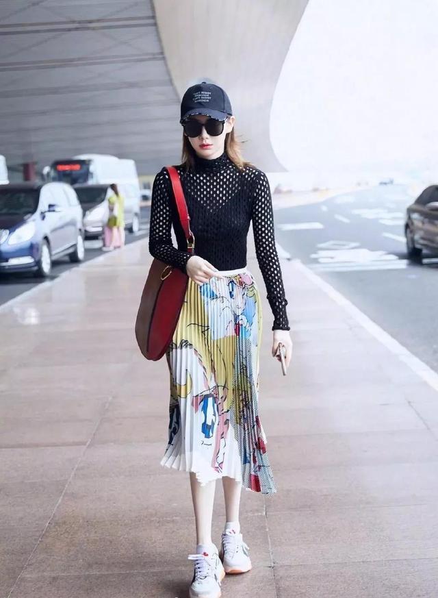 戚薇这款裙装搭配就不同于她以往的韩式可爱风,在风格上成熟妩媚了不少也更加适合她。渔网款黑色长衫营造欧美风野性美,低领内搭更是诱惑十足。下半身搭配卡通花色百褶长裙,不是那种常规的优雅风,浓郁的色彩更显活力感。