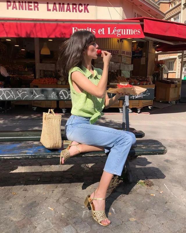 要说什么能凸显女人味又不需要露肉呢?最好的答案就是牛仔裤啦。牛仔裤百搭几乎能跟所有元素结合,就像图片中的这套搭配。草绿色背心有点法式优雅,搭配九分直筒牛仔裤干净清爽,露出的纤瘦的脚踝更是直男眼中诱惑的标志。