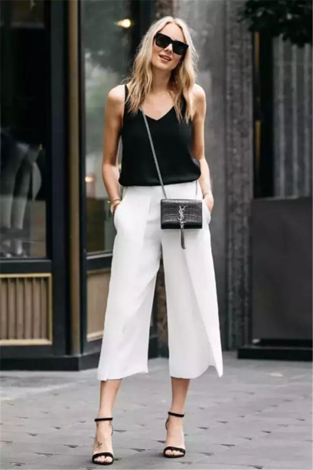 大家在穿搭的时候一定要学会利用颜色之间的搭配,如果你喜欢黑色的单品,那么可以使用其他亮一点的色彩进行点缀,起到画龙点睛的作用。比如黑白色彩的经典配色,黑色的吊带与白色阔腿裤的结合使得整个穿搭都变得有生机了很多,高级却不失格调。
