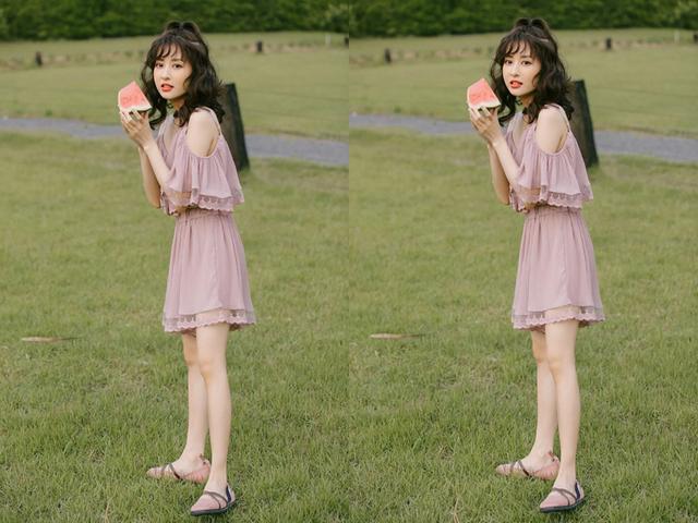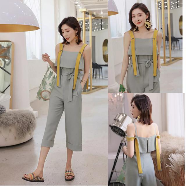 3、很淑女的一款连体裤,七分的阔腿裤设计,让那些腿粗又有点腿短的妹子不再那么的头痛,上身显高又显腿瘦,上半身撞色的吊带设计,个性时髦,让你整个人看起来是那么的清爽,那么的好看,吊带是可以自由调节的,所以小个子的你也不用担心你驾驭不了,前面活页的设计,让你身体的比例更加地明确,轻松拉高整体的比例效果,看起来高挑多了,后面的设计更是点睛亮眼了,淡淡的蓝色,清新又好看,又有种显白的效果,再搭配一双凉鞋,超超超好看的哦。