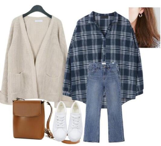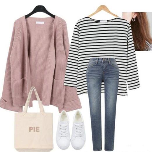 穿出法式优雅休闲装,横条纹内搭必不可少。偏休闲的搭配技巧黑白横条纹圆领打底衫外搭豆沙粉竖坑条廓形无扣毛衣开衫,外套的竖条纹纵向拉长身材线条,中和横条纹的膨胀感;下装选择高腰水洗蓝修身直筒牛仔裤和小白鞋穿出一米八大长腿。搭配浅粉色字母印花帆布袋则更轻松随性。