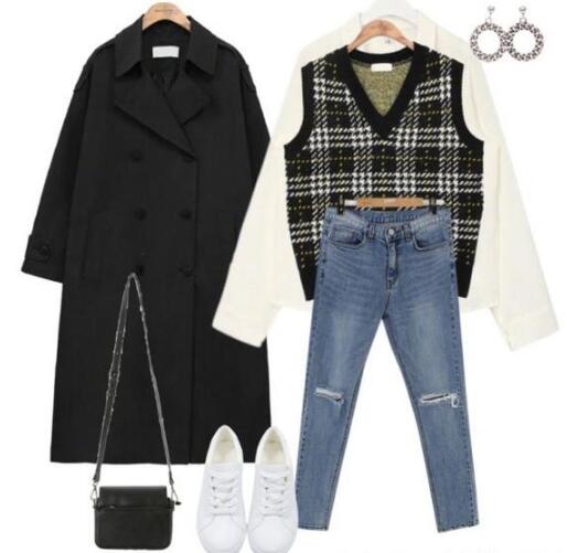 日常休闲装穿出学院风,格纹背心是重点。白衬衫搭配黑白格纹V领背心就是标准学院风上装,吊牌额破洞九分修身牛仔裤和小白鞋更穿出学生般青春活力,外搭黑色廓形双排扣大衣、黑色小方包,配饰采用黑白格纹圈形大耳环与内搭背心呼应,休闲同时不失精致知性风范。