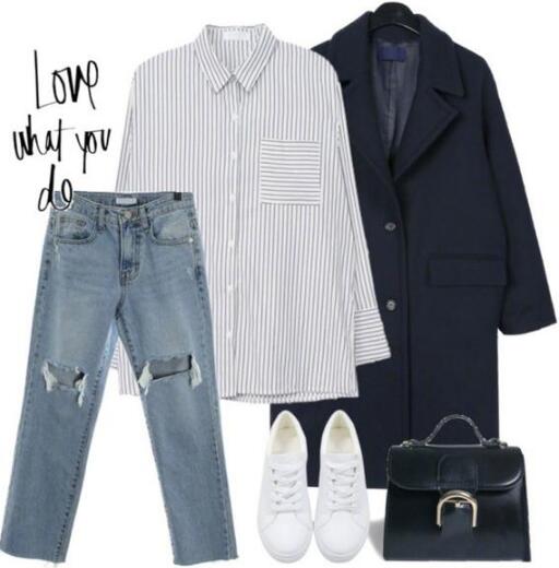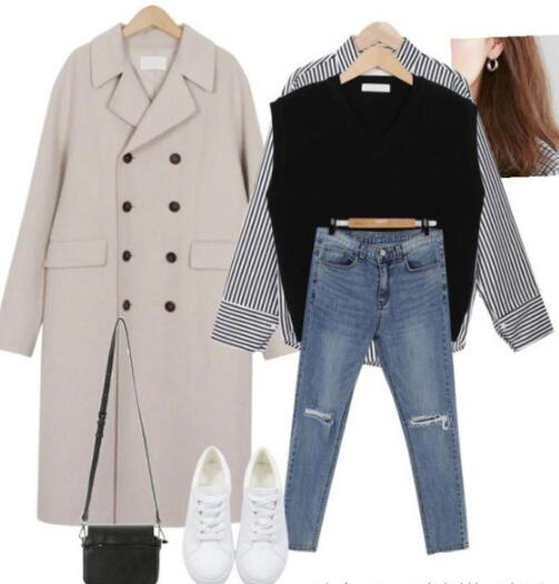 横条纹这么流行但小仙女们难免担心它显胖,同样是条纹,竖条纹就是显瘦利器。黑白竖条纹衬衫搭配黑色V领宽松背心,竖条纹+深色外搭背心是显瘦双保险;下装采用破洞九分修身牛仔裤和小白鞋则穿出轻松休闲感还能减龄;外搭浅灰色双排扣廓形风衣和黑色小方包,知性气质和精致感一个不少。