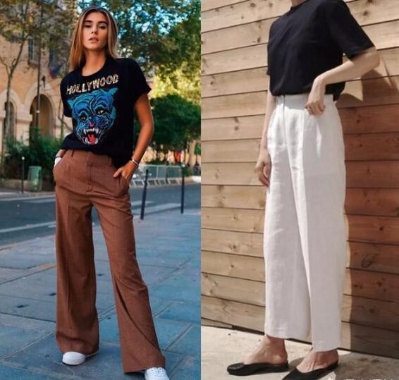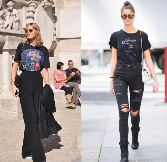 黑色T恤搭配阔腿裤气场十足,而且这种搭配也不挑身材,小个子女生可以把裤子塞进裤子里,拉长身材比例,身材高挑的女生,T恤垂顺下来,随意又拉风。