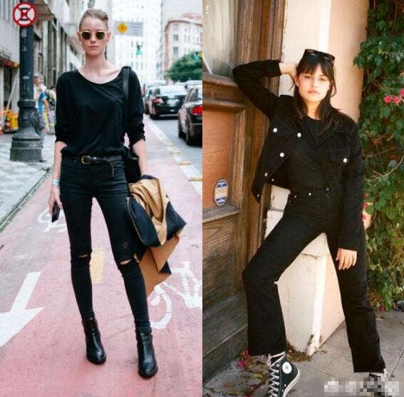 一身黑的穿搭极具个性了,黑色牛仔裤搭配黑色T恤,黑色裸靴,再搭配黑色皮带点缀,酷范十足,膝盖的小破洞凸显了一点可爱感,干练帅气又时髦,又或者黑色阔腿牛仔裤+黑色T恤+黑色外套+黑色高帮帆布鞋,头发上架着墨镜,妥妥的超模范,走在街头,回头率十足。