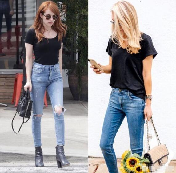 T恤简单又随意的搭配就是跟牛仔裤一起,尤其是搭配带有破洞元素的牛仔裤,尽显不羁个性,又突破了黑色本身的沉闷感,手提纯色小包,颜色简单大气,完全不会出错的搭配。
