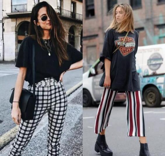 黑色T恤搭配黑白格子直筒裤,颈部加上项链点缀,很有法式风情的味道,黑色印花T恤搭配黑白红拼接条纹,复古英伦风。