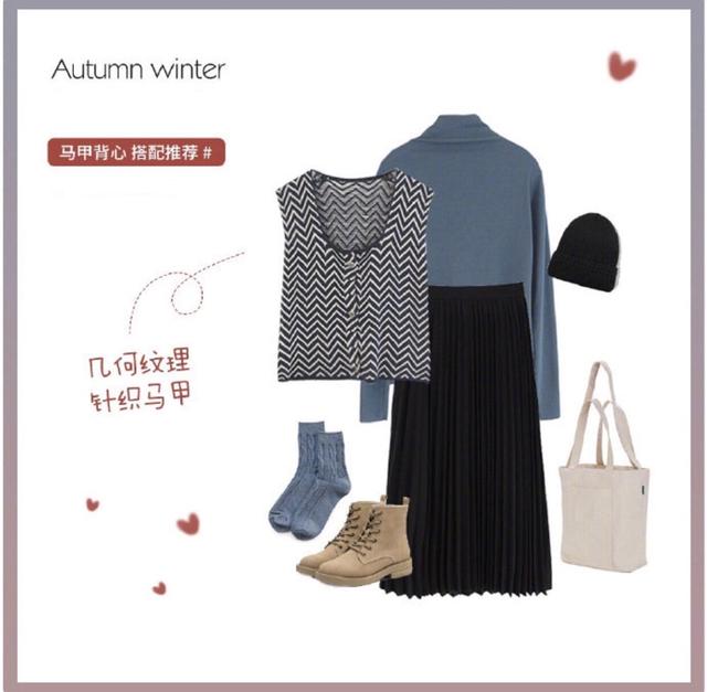 这套穿搭是相对比较优雅和轻熟的,非常适合上班通勤的女人穿搭,能够展示气质,还能够让你保持温暖。蓝色的不饱和内搭搭配一款条纹的暗色毛衣背心,让你穿搭有品味。同时搭配一条优雅的百褶半身裙,凸显女人精致又温柔的魅力。